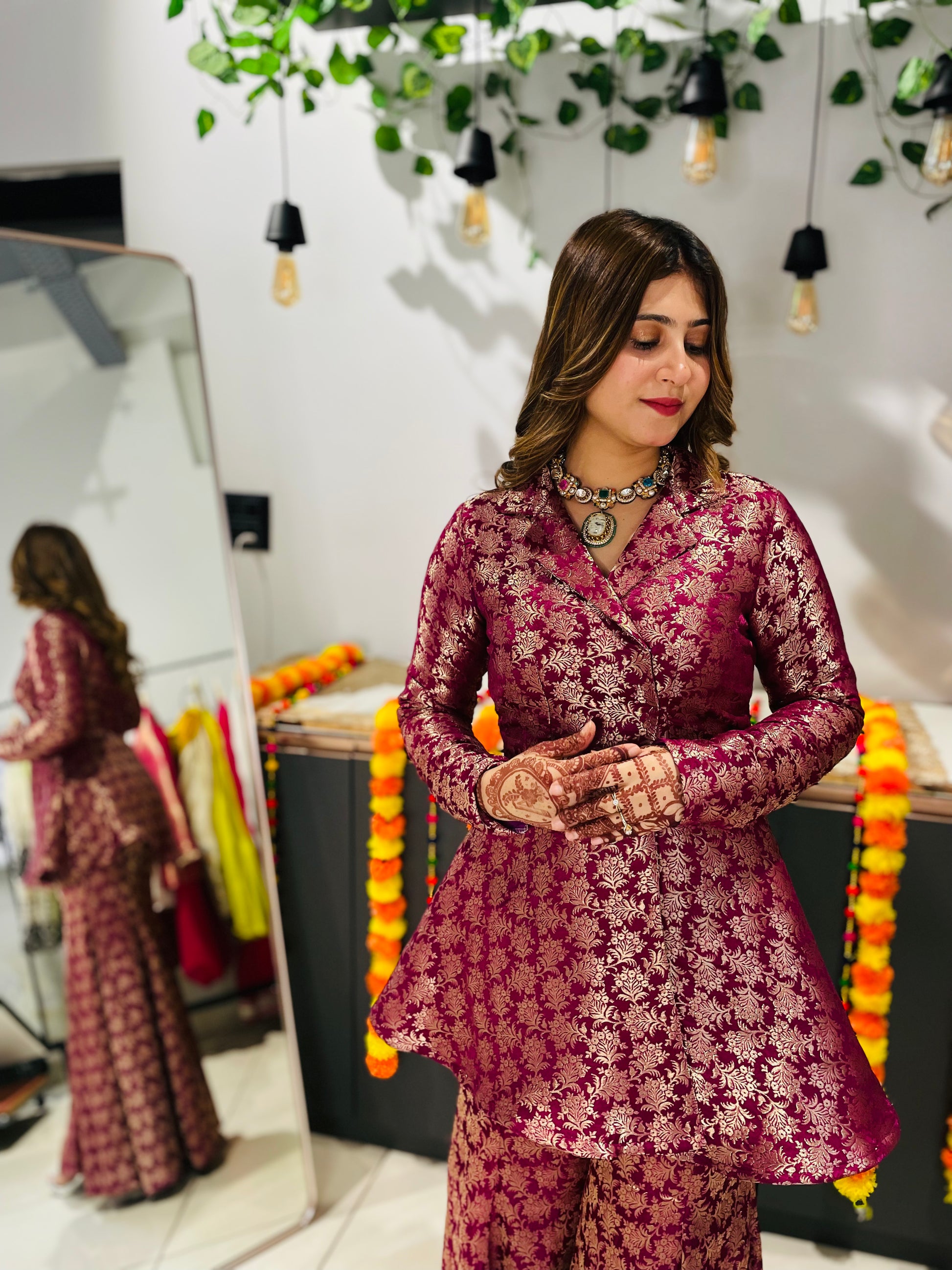 Royal Maroon Brocade Peplum Sharara Set – Festive & Wedding Wear for Women
